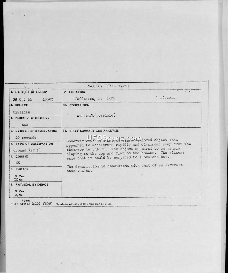 Project 10073 Record — Jefferson, New York, 28 Oct 66