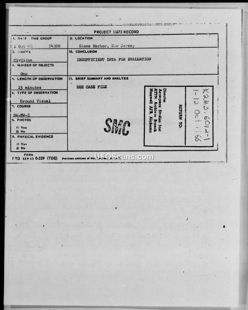 Project 10073 Record — Sighting in Stone Harbor, New Jersey, October 1, 1966