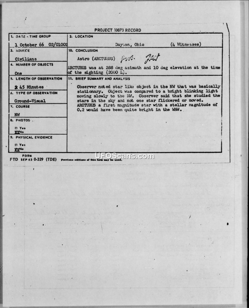 Multiple sightings reported in Dayton, Ohio, during October 1966 were evaluated by Project Blue Book. Many were identified as astronomical objects (Arcturus, Jupiter, Capella) or satellites (Echo II), while others were deemed to have insufficient data for evaluation.