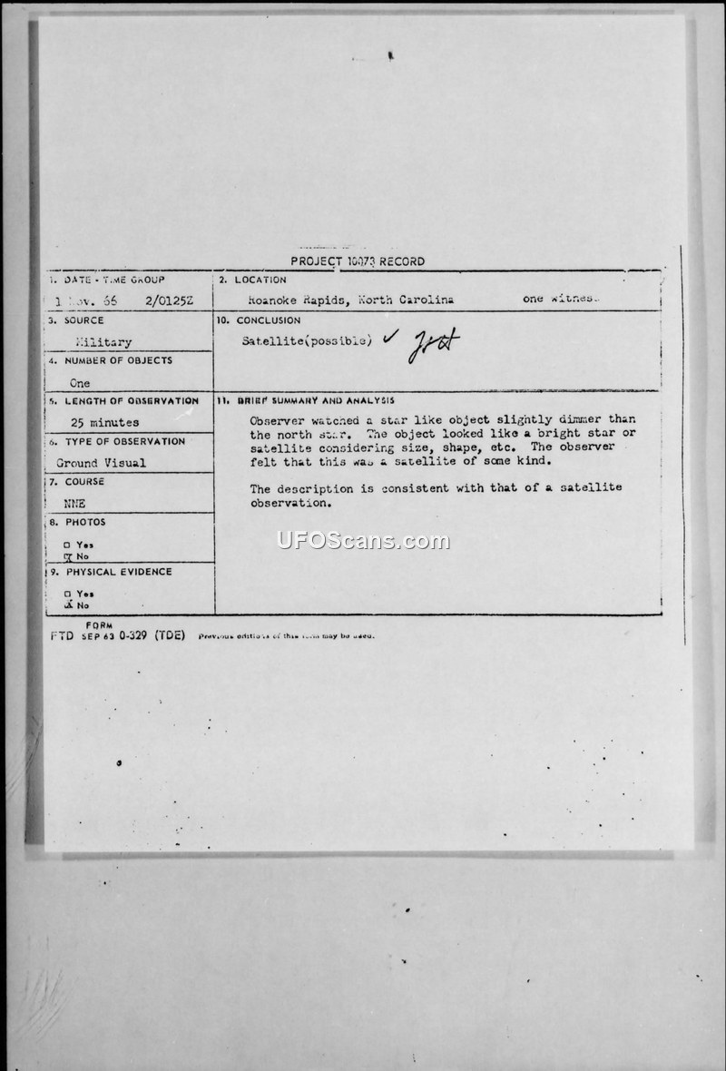 Project 10073 Record — Sighting Report, 1 November 1966, Roanoke Rapids, North Carolina