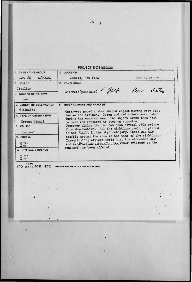 Project 10073 Record — Monroe, New York, 3 November 1966