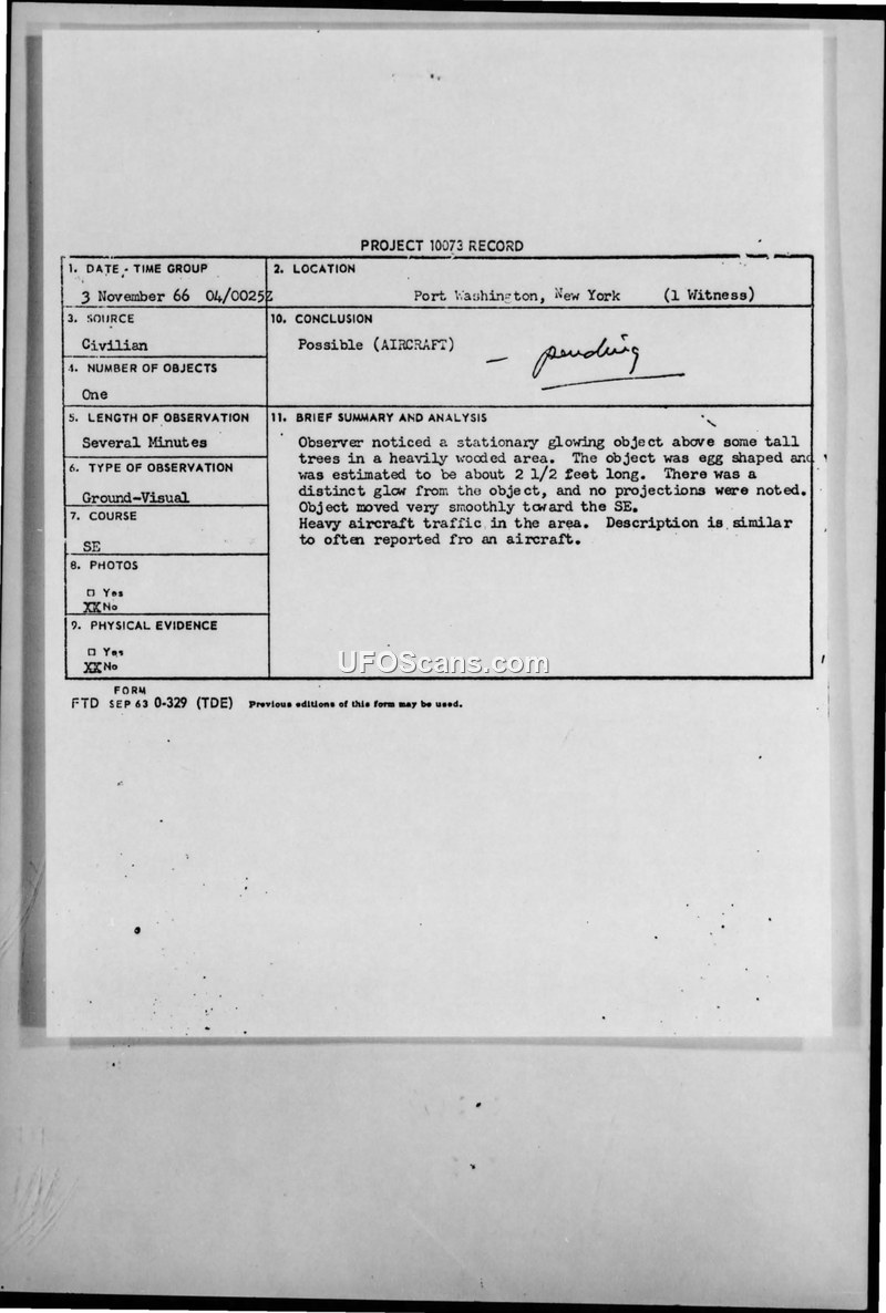 A former pilot and CIA employee reported a small, glowing, egg-shaped object in Port Washington, New York, in 1966. The official military record classifies the sighting as a possible aircraft.