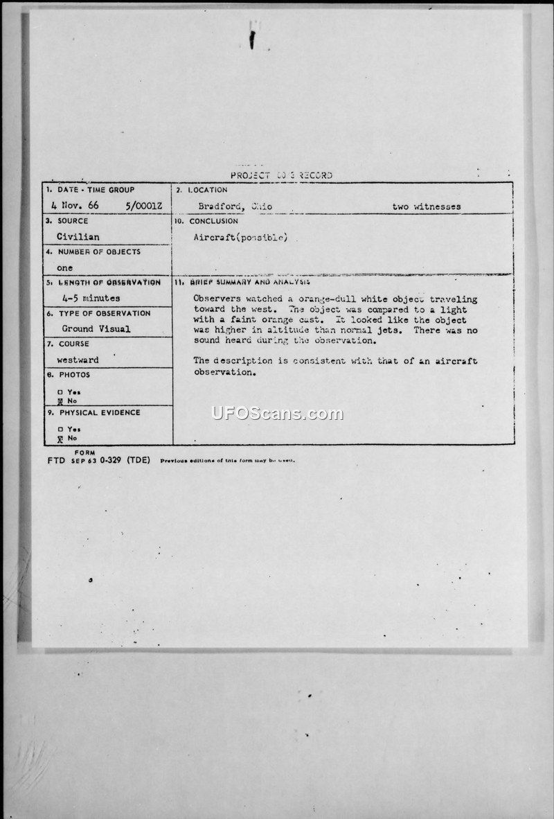 A 16-year-old witness in Bradford, Ohio, reported a silent, dull white object with an orange cast on November 4, 1966. The Air Force concluded the sighting was likely an aircraft.