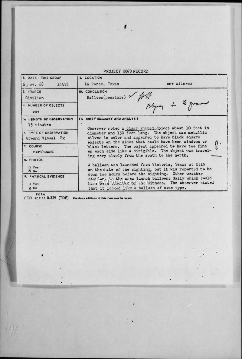 On 6 November 1966, at 1445Z, a civilian witness, Louis Fontenot, reported observing an unidentified aerial object over La Porte, Texas. The object was described as a metallic, cigar-shaped craft, approximately 150 feet long and 10 feet in diameter. The witness, a Port Captain at the Anchor Boat Works, observed the object for 15 minutes using 50-power binoculars. He noted black square markings on the sides and two fins, comparing its appearance to a dirigible. The object moved slowly from south to north at an estimated altitude of 15,000 feet and a speed of 100 MPH. The witness also reported seeing a jet aircraft in the vicinity, which he believed was flying at a higher altitude and did not appear to notice the object. The official investigation, conducted by Major Laurence R. Leach, Jr. of the 2578th Air Base Squadron, examined the possibility of a weather balloon. Records from the U.S. Weather Bureau in Victoria, Texas, confirmed a balloon launch at 0515 on the day of the sighting, but noted that the balloon burst at an altitude of 101,046 feet at 0657 CST, nearly two hours before the sighting occurred. Despite this discrepancy, the observer maintained his opinion that the object was a balloon of some type. The investigating officer concluded that no other logistical explanation could be identified for the sighting.