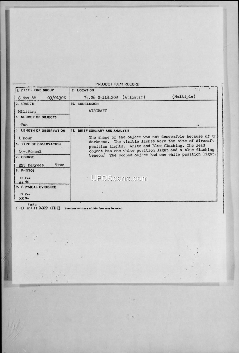 On November 8, 1966, the crew of a KC-135 aircraft, call sign BALMY-57, observed two unidentified objects while in flight to Eielson AFB, Alaska. The observation lasted approximately one hour, beginning at 0130Z at coordinates 74.26N 118.20W and ending at 0230Z at 69.30N 137.00W. The crew, including Aircraft Commander Captain Charles W. Bond, Co-pilot Captain Robert L. Saucier, Navigator 1st Lt Gerald M. Week, and Boom Operator SSgt Frank G. Harvy, reported that the objects were not discernible in shape due to darkness but appeared as flashing white and blue lights, similar in size to standard aircraft position lights. The lead object displayed a white position light and a blue flashing beacon, while the second object displayed a single white position light. The objects maneuvered alongside the KC-135 twice before dropping back into a trail formation. The aircraft commander reported that he attempted to signal the objects by flashing his own lights, but received no response. No trail, exhaust, or sound was noted from the objects. The FAA confirmed there were no scheduled flights in the area at the time. In subsequent correspondence dated March 18, 1967, Captain Bond clarified that he had informed the debriefing officer of his belief that the objects were two small aircraft in formation. He further noted that he was initially told he was filing an 'unusual Incident Report' and was unaware that it had been processed as a 'UFO report' until receiving correspondence from Lt Colonel George P. Freeman, Jr. The official conclusion recorded in the project documents identifies the objects as aircraft.
