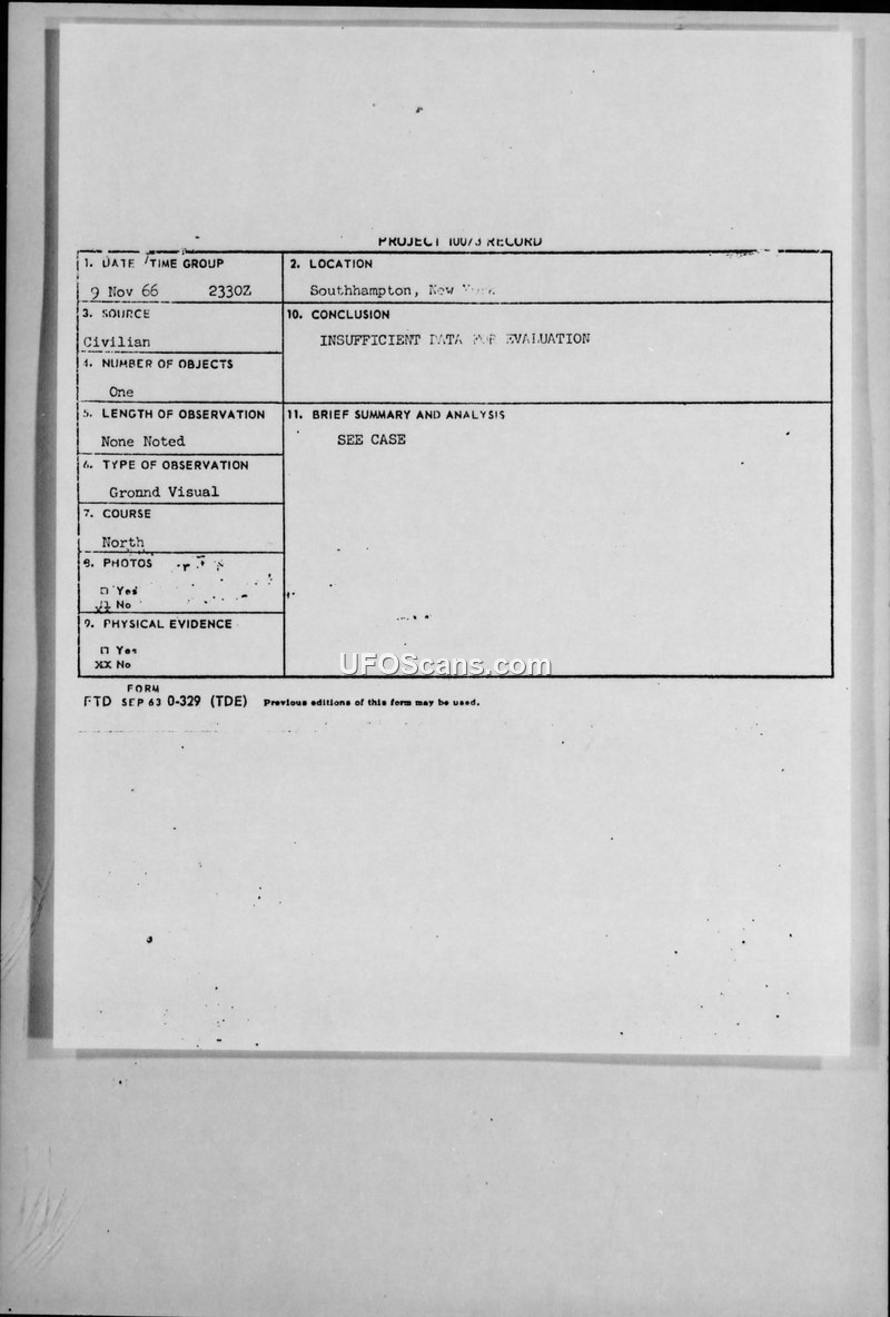 Project Blue Book Sighting Report — Southampton, New York, 9 November 1966