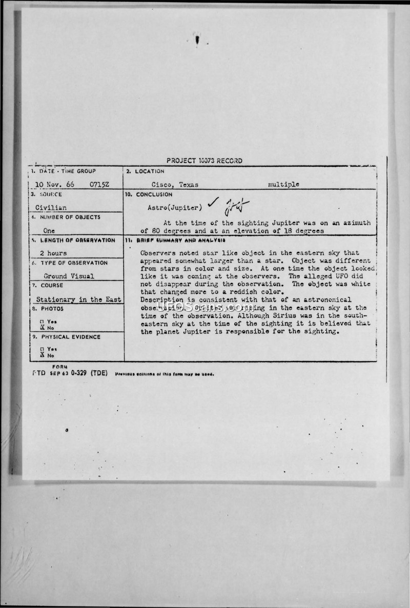 Project 10073 Record — Sighting in Cisco, Texas, 10 November 1966
