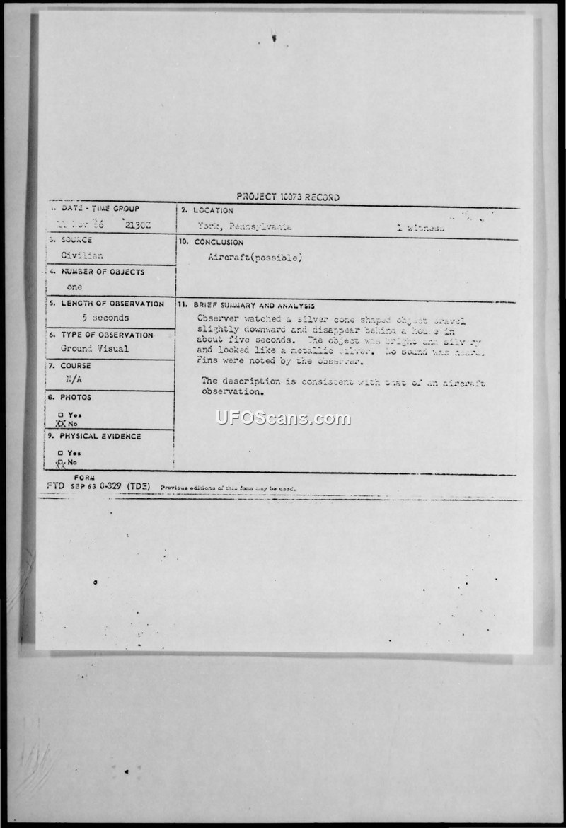On November 11, 1966, at 2130Z, a civilian witness in York, Pennsylvania, observed an unidentified aerial object. The witness described the object as a metallic, silver, cone-shaped craft featuring fins. The object was observed for approximately five seconds as it traveled in a slightly downward trajectory before disappearing behind a house. The witness, an 18-year-old male, reported the incident to his parents and siblings. Upon attempting to relocate the object after it vanished behind the house, the witness was unable to find it again. The witness noted that the object made no sound. The U.S. Air Force documented this event under Project 10073. The official conclusion reached by the Air Force was that the description provided by the witness was consistent with that of an aircraft.