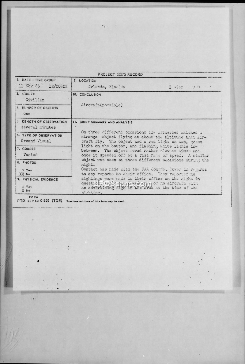 Project 10073 Record — Orlando, Florida, 11 November 1966