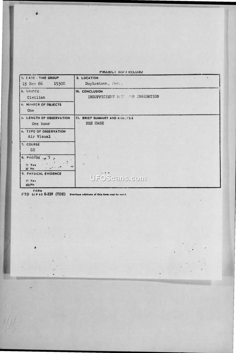 A civilian reported a one-hour UFO sighting in Doylestown, PA, on 15 November 1966. The Air Force, led by Major Hector Quintanilla, Jr., concluded the data was insufficient for evaluation.