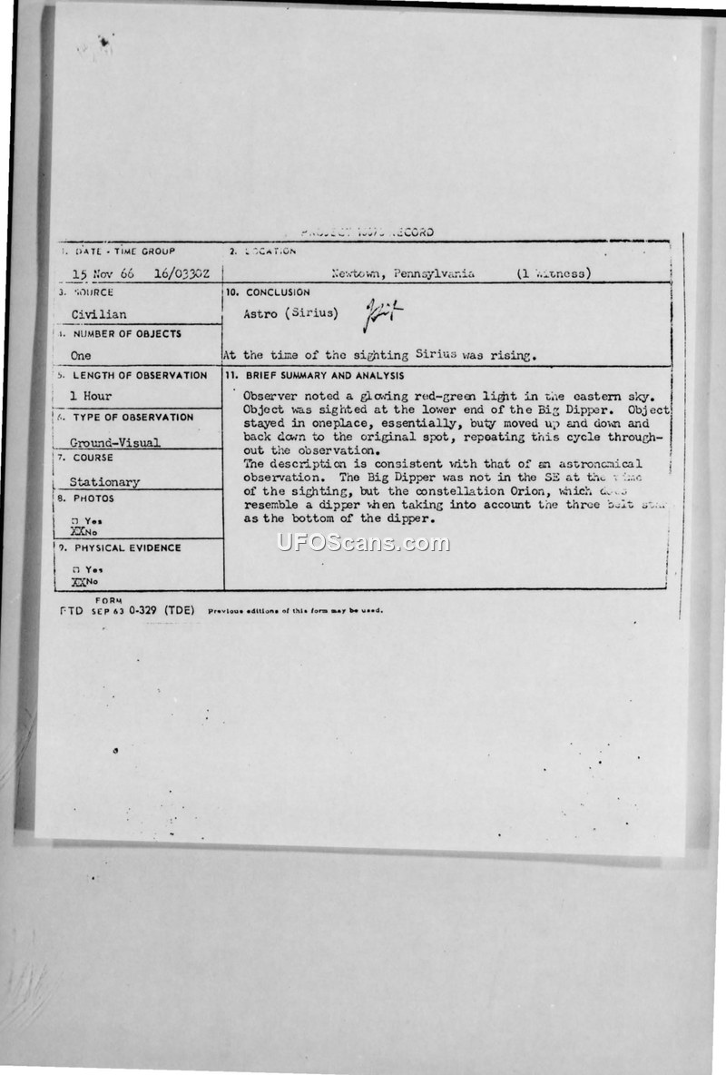 This document is a Project 10073 sighting report detailing an observation made on November 15, 1966, in Newtown, Pennsylvania. A civilian witness reported observing a glowing red-green light in the eastern sky for approximately one hour. The witness described the object as remaining stationary in one place, but moving up and down in a repeating cycle. The witness initially believed the object was located at the lower end of the Big Dipper. The official Air Force analysis concluded that the object was the star Sirius, which was rising at the time of the observation. The report further notes that the Big Dipper was not in the southeastern sky at the time of the sighting, and suggests that the witness likely misidentified the constellation Orion, which contains three stars that could be mistaken for the bottom of a dipper. The witness reported the sighting to the Naval Air Station in Willow Grove, Pennsylvania.