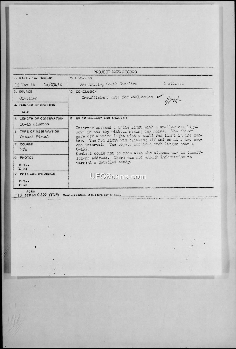 Project 10073 Record — Greenville, South Carolina, 15 Nov 66