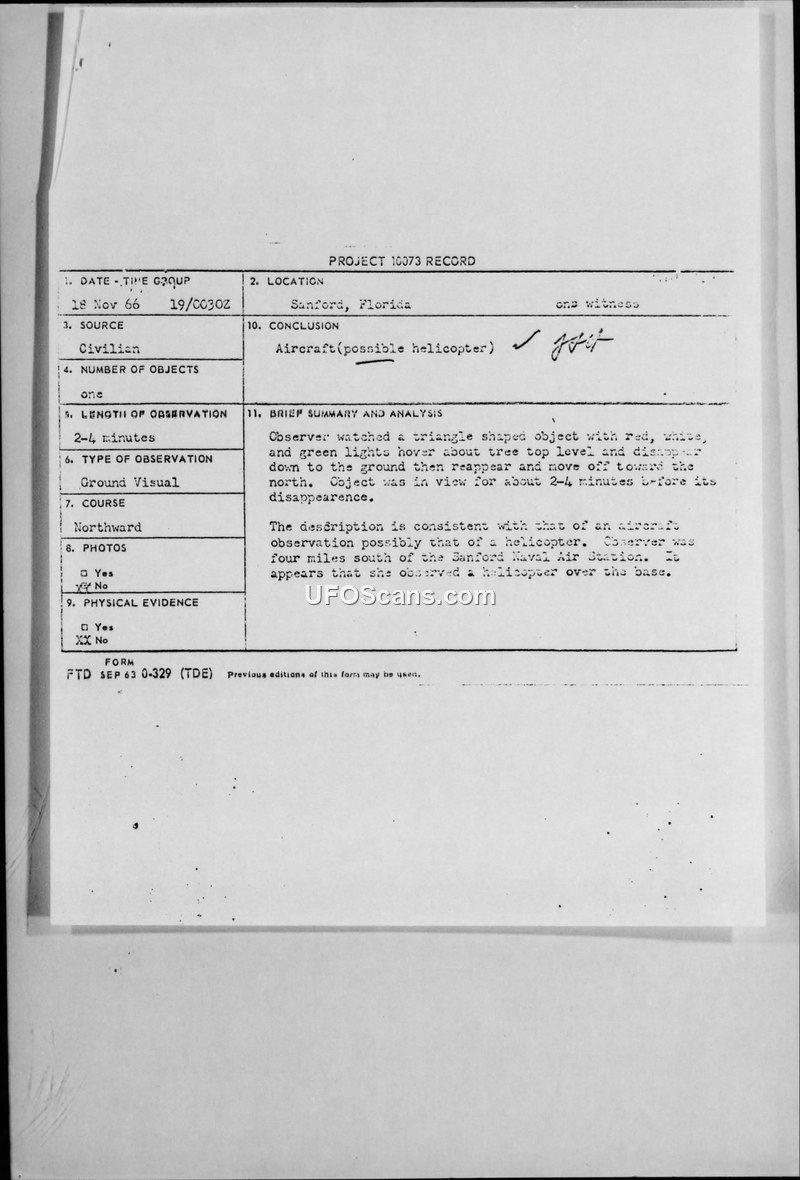 A civilian reported a triangular UFO with red, white, and green lights near Sanford, Florida, on 18 November 1966. The Air Force concluded it was likely a helicopter, though the investigating officer noted it remained unexplainable by his office.