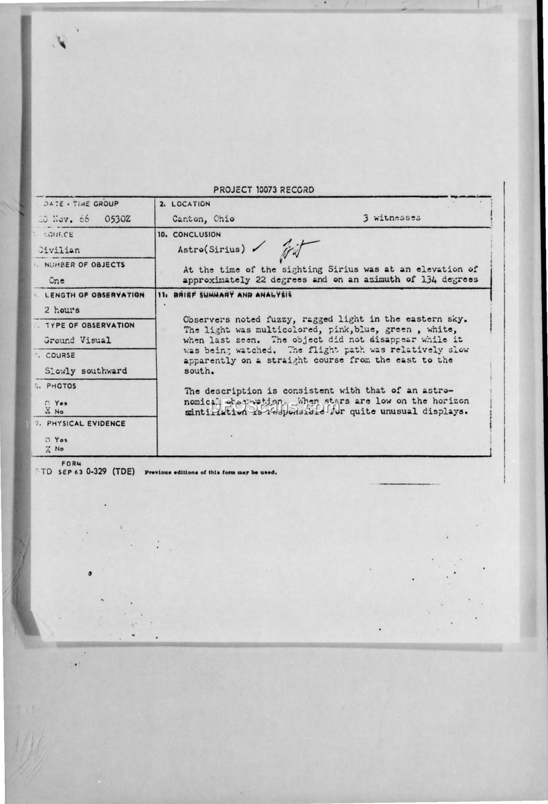 A 1966 U.S. Air Force report documenting a two-hour sighting of a multicolored light in Canton, Ohio. The investigation concluded the object was the star Sirius, affected by atmospheric scintillation.