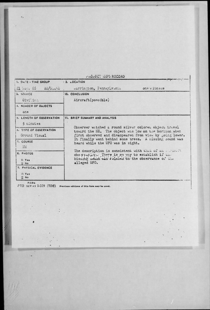 Project 10073 Record - Warrington, Pennsylvania - 21 November 1966