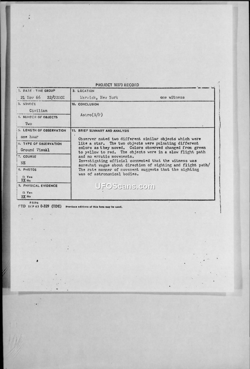 Project 10073 Record — Warwick, New York, 21 November 1966
