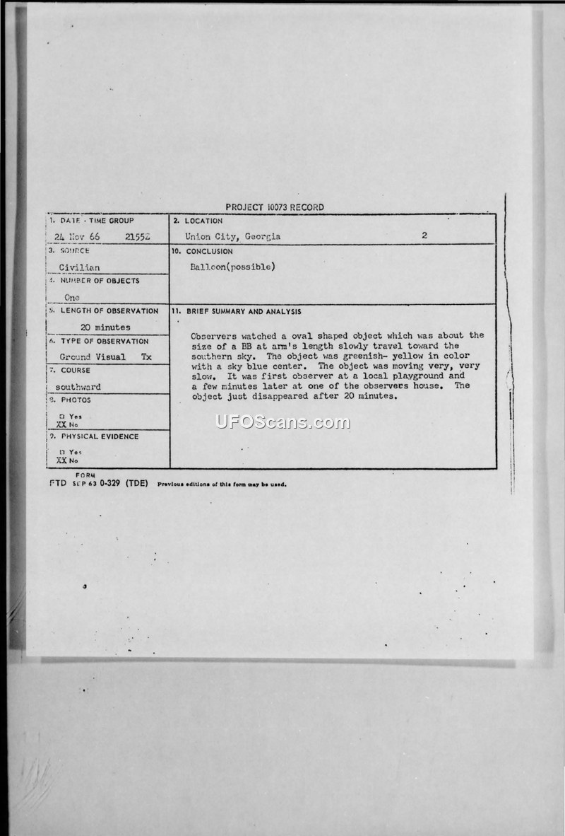 Project 10073 Record: UFO Observation, Union City, Georgia, 24 Nov 1966