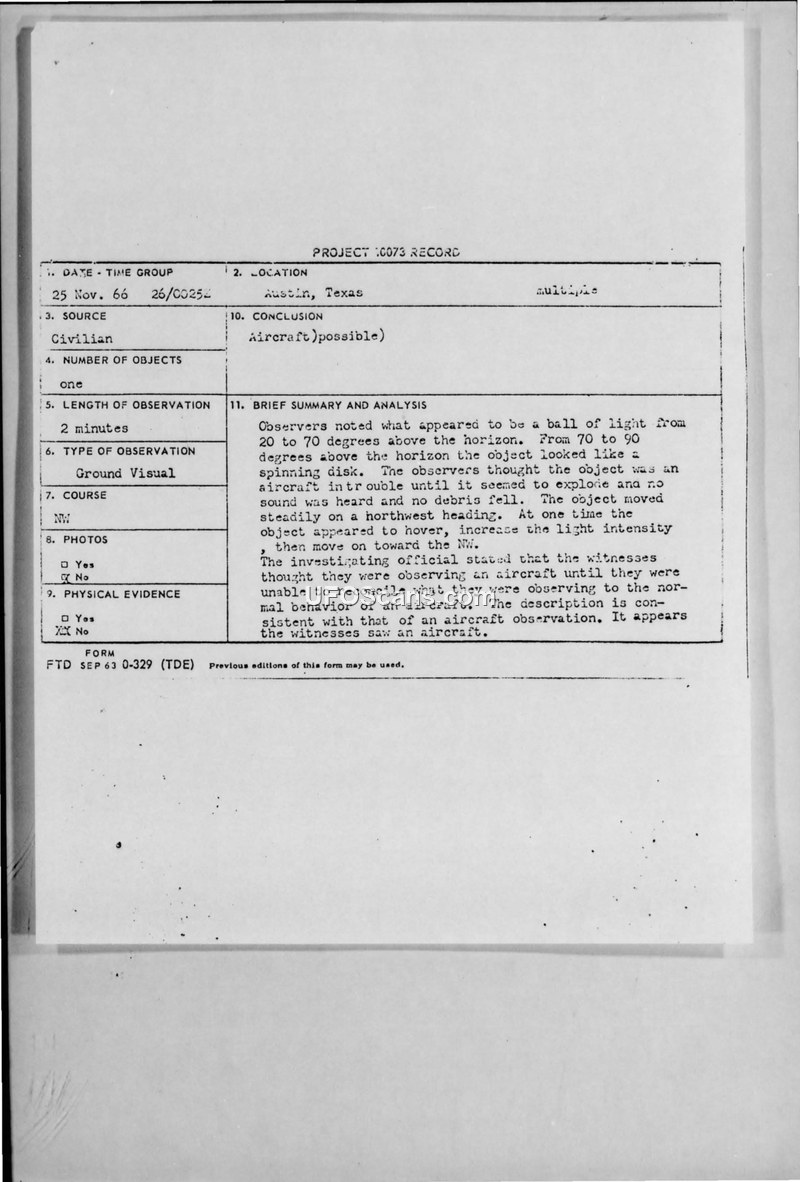 Project 10073 Record — Sighting Report, Austin, Texas, 25 November 1966