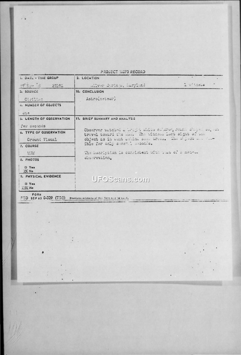 A 1966 sighting of a bright white object in Silver Spring, Maryland, was officially concluded by the Air Force to be a meteor. The report includes witness details, operational assessments, and follow-up correspondence that was ultimately returned as undeliverable.