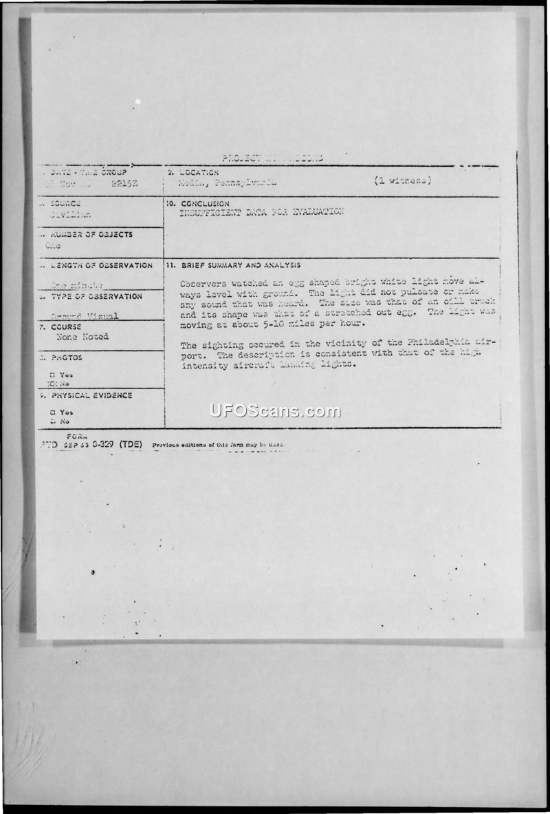 A civilian reported an egg-shaped, white, silent object in Media, Pennsylvania, on November 28, 1966. Project Blue Book concluded there was insufficient data, noting the description was consistent with aircraft landing lights.