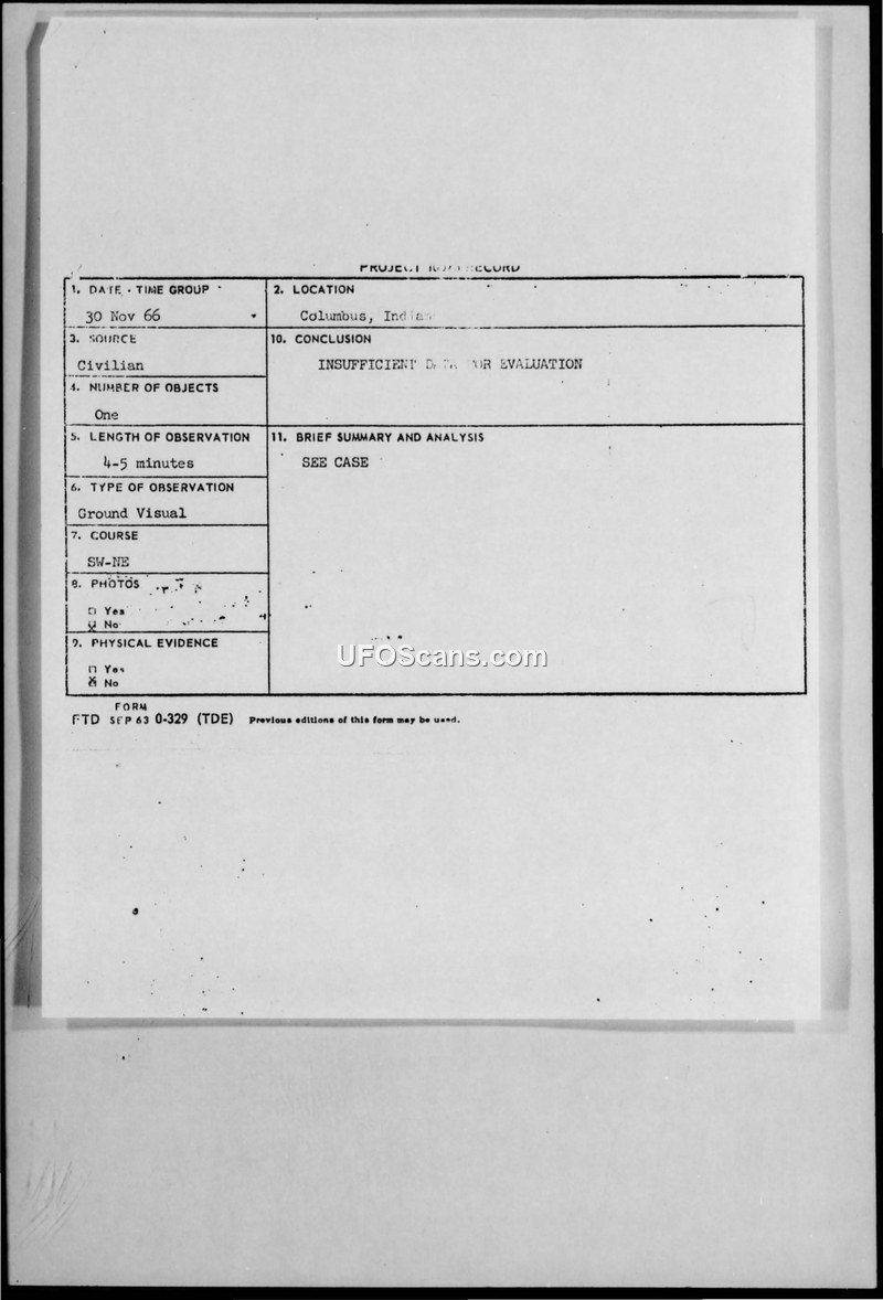 UFO Observation Report — Columbus, Indiana, 30 November 1966