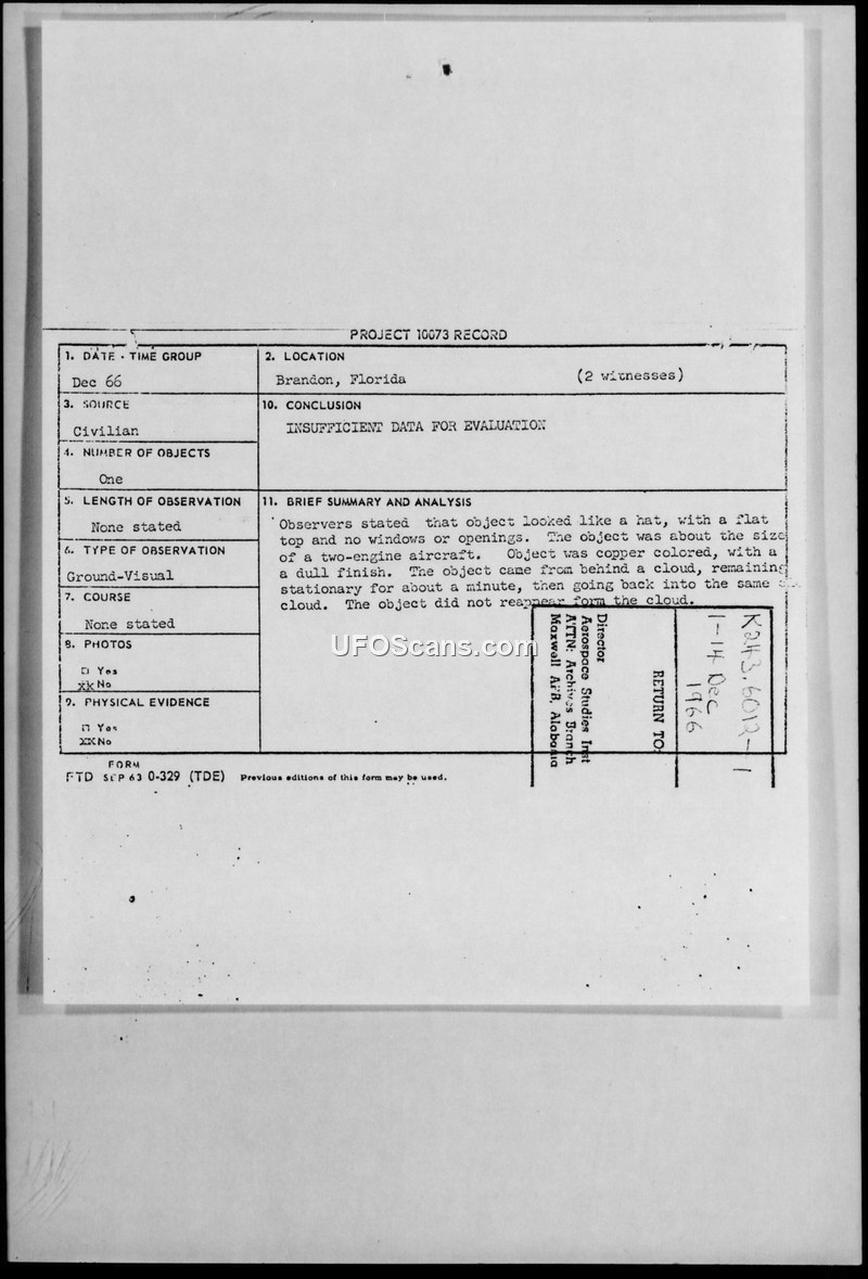 Unidentified Flying Object Report — Brandon, Florida, December 1966