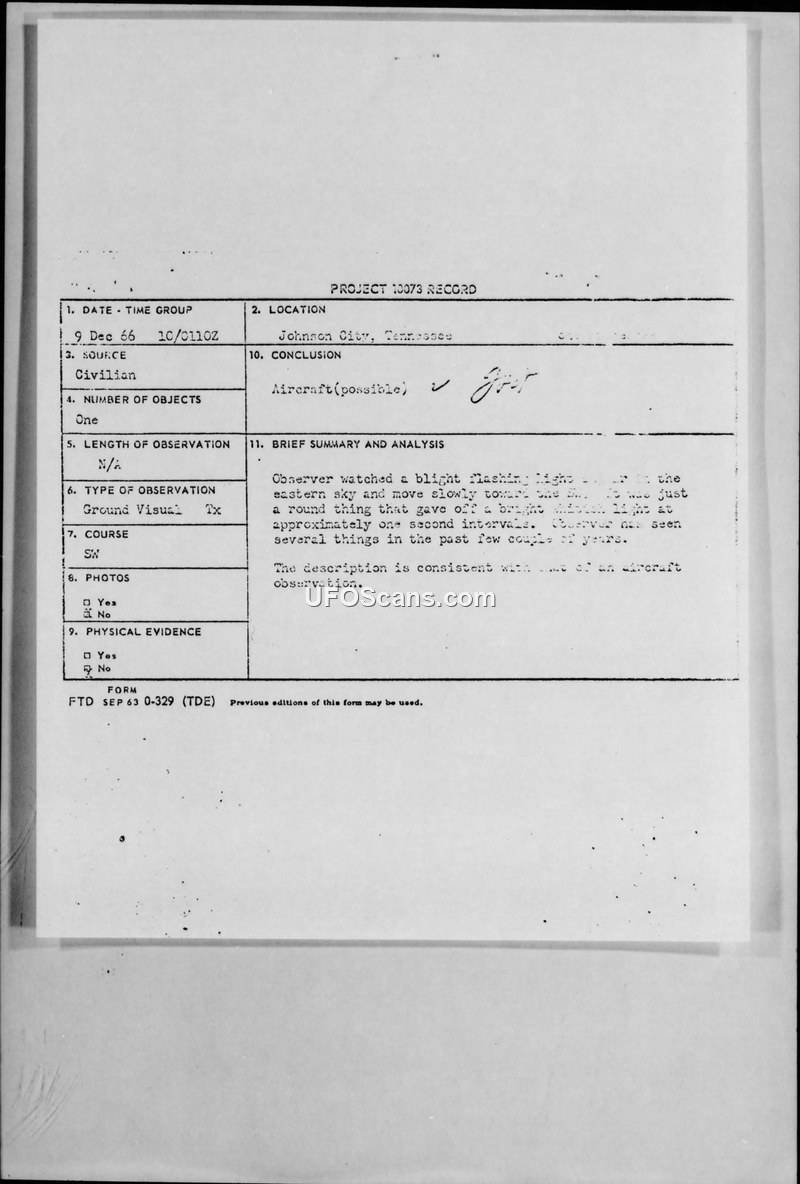 A civilian witness in Johnson City, Tennessee, reported a flashing, round aerial object on December 9, 1966. The official military assessment concluded the object was possibly an aircraft.