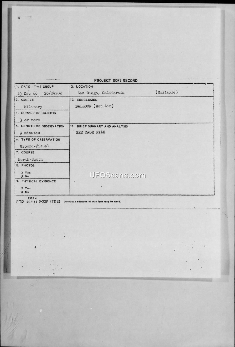 Project 10073 Record: UFO Sighting Report, San Diego, California, 19 December 1966