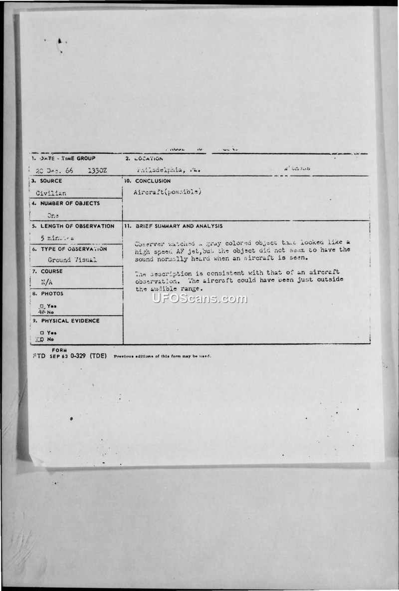 A civilian in Philadelphia reported a silent, gray, high-speed object resembling a jet on December 20, 1966. The Air Force concluded the object was likely an aircraft flying at a distance.