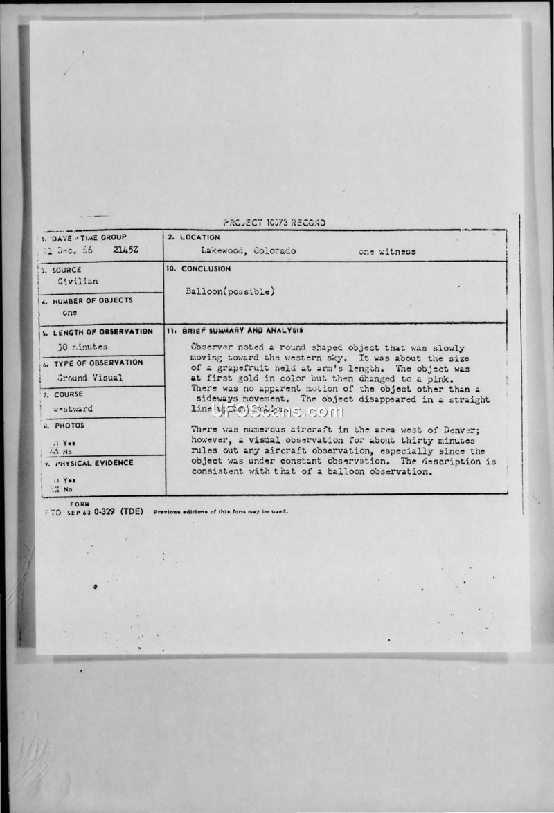 Project 10073 Record: Sighting in Lakewood, Colorado, 11 December 1966