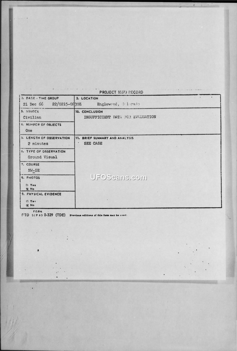 A civilian in Englewood, Colorado, reported a red, saucer-shaped object performing erratic maneuvers on December 21, 1966. The Air Force classified the report as having insufficient data for evaluation and requested further information from the witness.