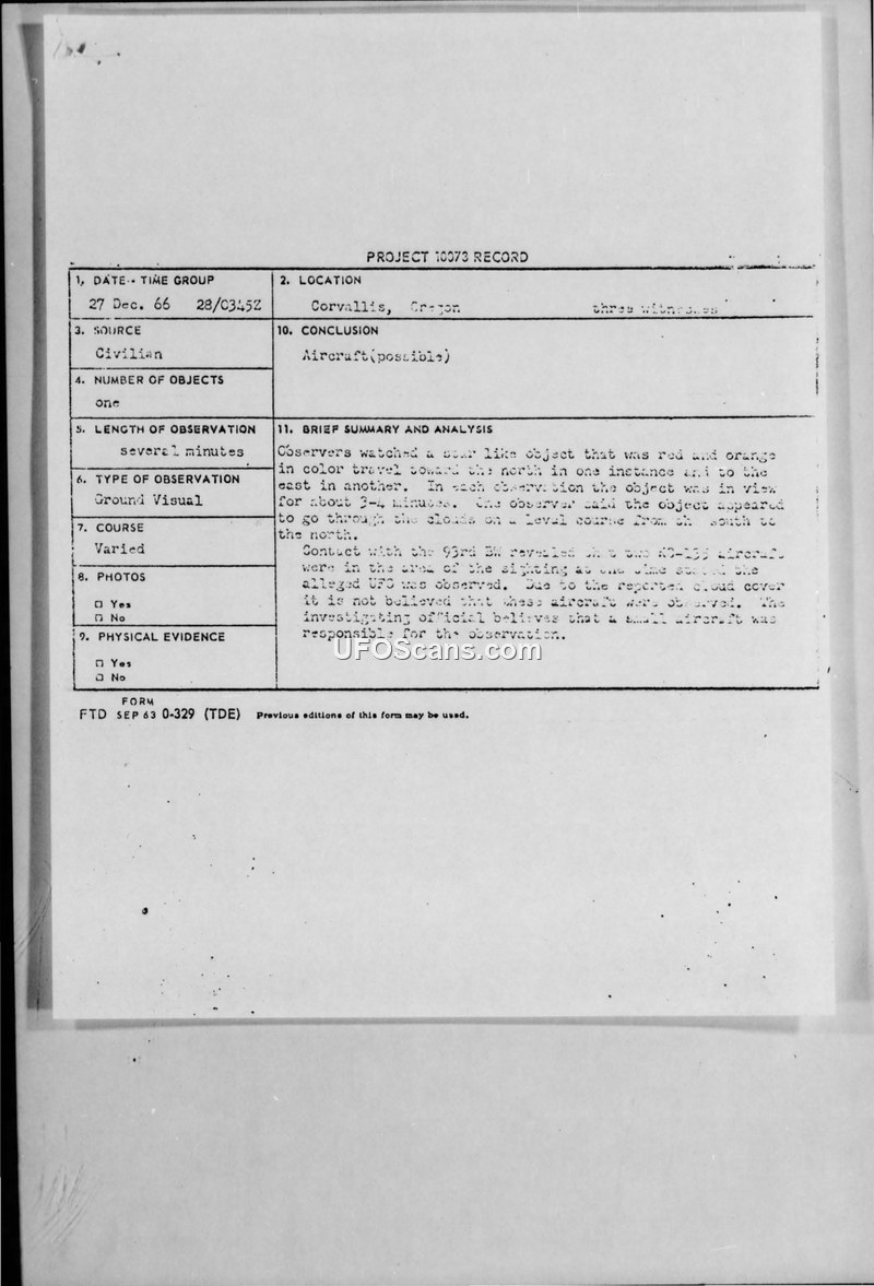 Project 10073 Record — Corvallis, Oregon, 27 Dec 66