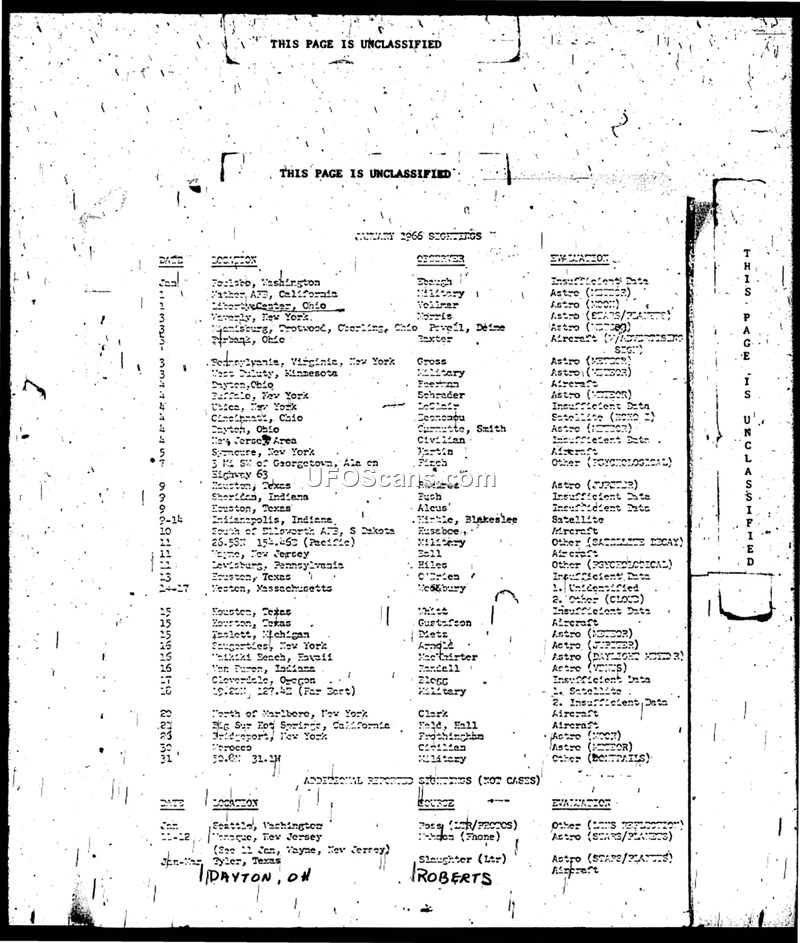 This document is a chronological log of UFO/UAP sightings reported during 1966. It categorizes hundreds of individual reports by date, location, observer, and official evaluation.