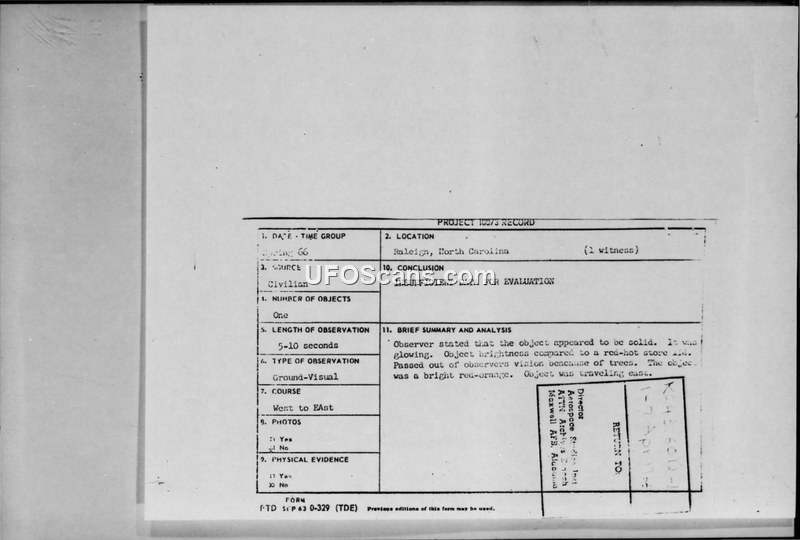 A 1966 sighting report from Raleigh, NC, detailing a glowing red-orange object observed by a postal worker. The official Air Force conclusion was that there was insufficient data for evaluation.