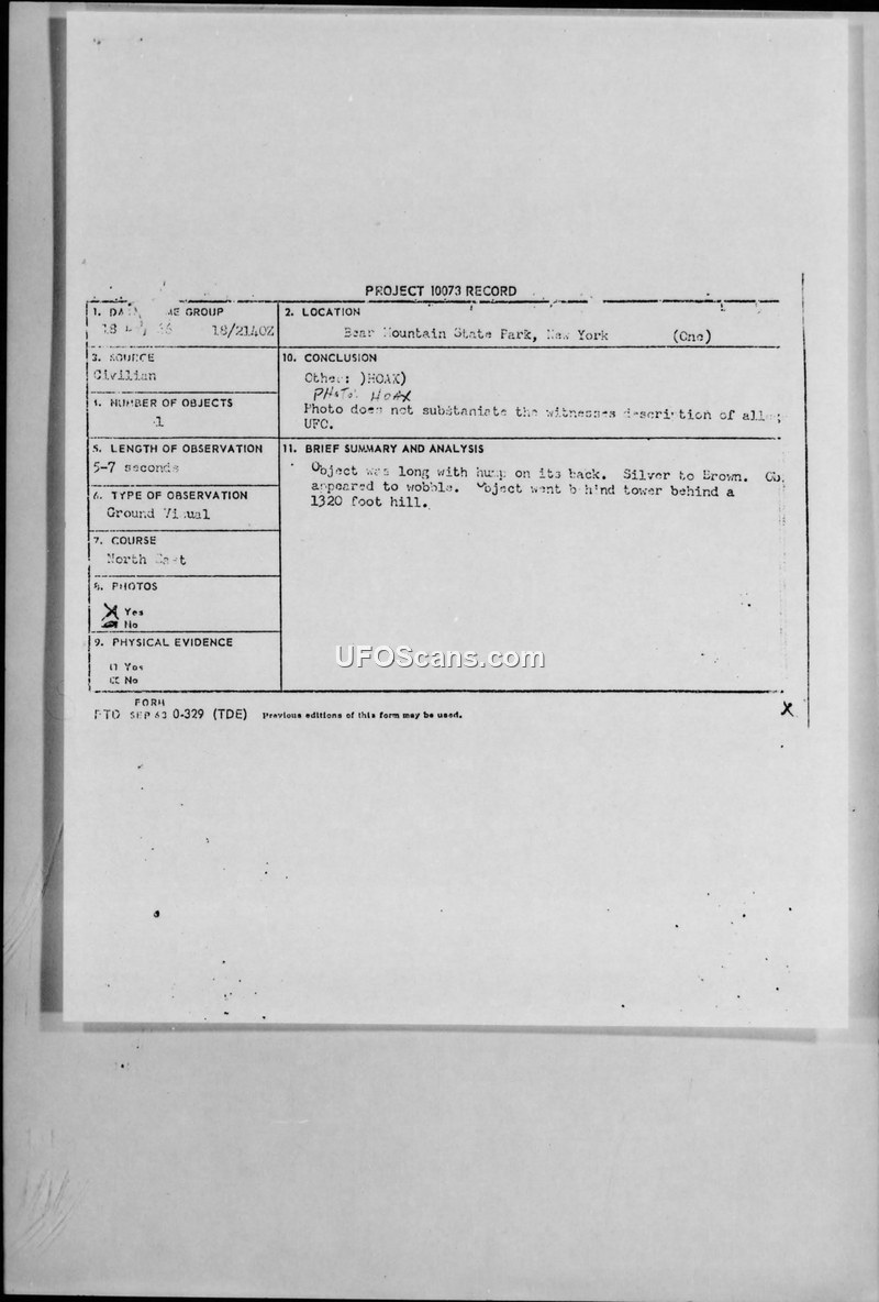 Project 10073 Record: UFO Sighting at Bear Mountain State Park, 18 December 1966