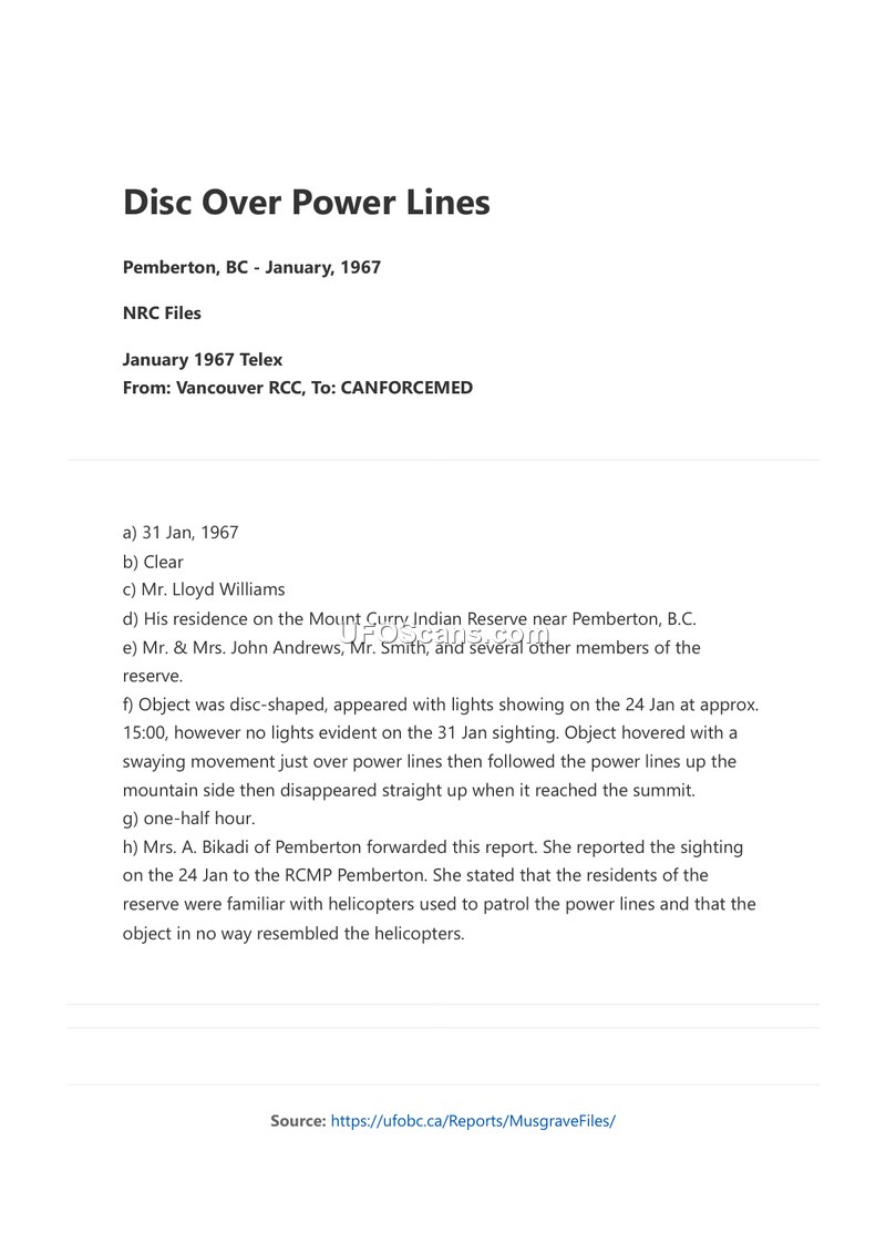 A telex report from January 1967 detailing a disc-shaped object sighting near Pemberton, B.C. Witnesses observed the object hovering over and following power lines for thirty minutes.