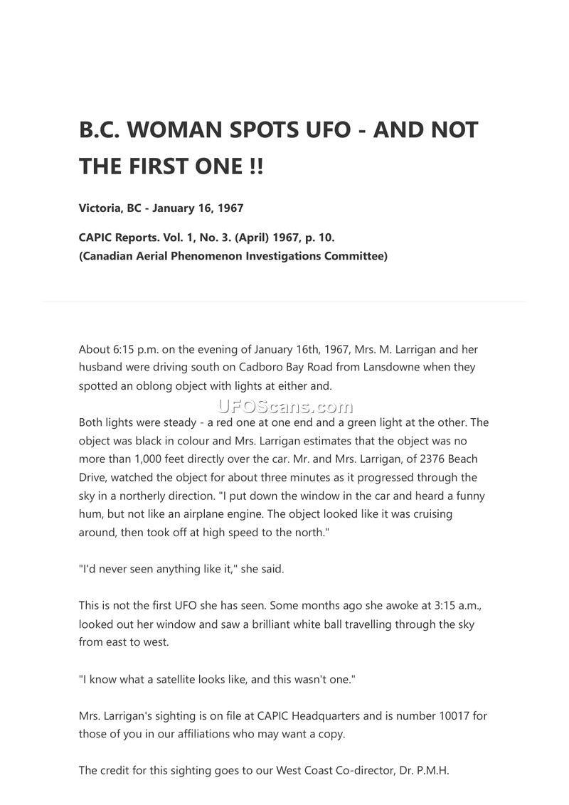 This document, published in the April 1967 issue of CAPIC Reports (Vol. 1, No. 3), details a UFO sighting reported by Mrs. M. Larrigan in Victoria, British Columbia. On the evening of January 16, 1967, at approximately 6:15 p.m., Mrs. Larrigan and her husband were driving south on Cadboro Bay Road when they observed an oblong, black object hovering no more than 1,000 feet above them. The object featured steady red and green lights at opposite ends. Mrs. Larrigan reported hearing a 'funny hum' that did not resemble an airplane engine. The object appeared to cruise in the area before accelerating at high speed toward the north. The sighting lasted for approximately three minutes. Mrs. Larrigan also noted a previous, separate sighting from several months prior, during which she observed a brilliant white ball traveling from east to west at 3:15 a.m., which she explicitly distinguished from a satellite. The incident is cataloged in the CAPIC files as case number 10017, and the report credits West Coast Co-director Dr. P.M.H. Edwards for bringing the experience to the committee's attention.