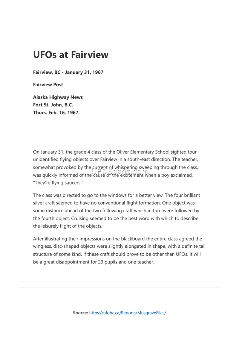 A grade 4 class and their teacher in Fairview, BC, reported sighting four silver, disc-shaped objects with tails on January 31, 1967. The account was published in the Alaska Highway News on February 16, 1967.