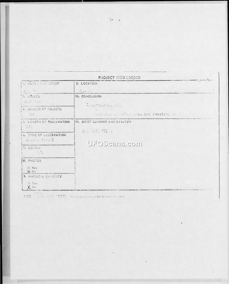 A Project 10073 sighting report from January 1967 concludes there was insufficient data to identify an object. The Air Force requested additional photographic evidence from the witness for further analysis.