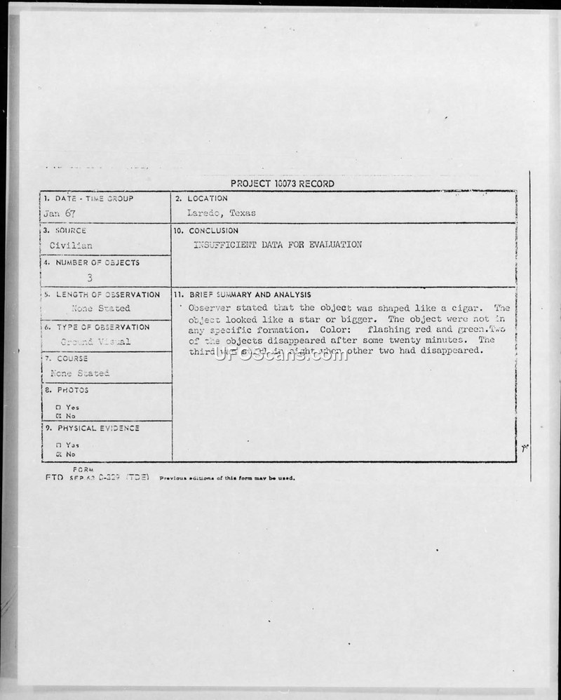 A civilian in Laredo, Texas, reported three cigar-shaped objects in January 1966. The Air Force concluded the sighting was likely a combination of a bright planet and a departing aircraft.