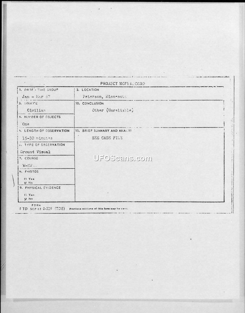 A civilian in Peterson, Minnesota, reported an unidentified aerial phenomenon in early 1967. The U.S. Air Force classified the report as 'Unreliable'.