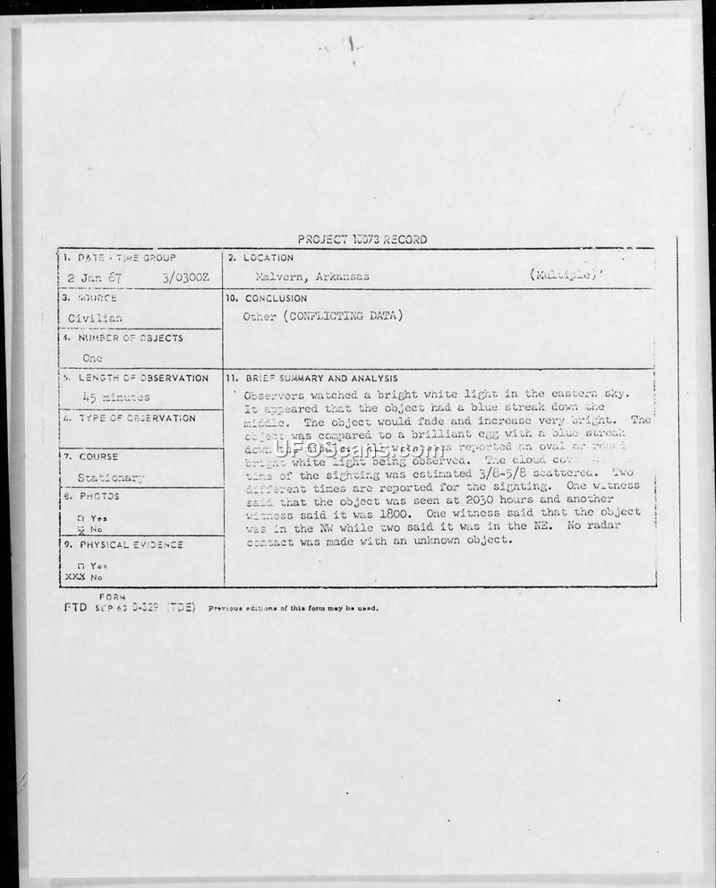 UFO Observation Report — Malvern, Arkansas, 2 January 1967