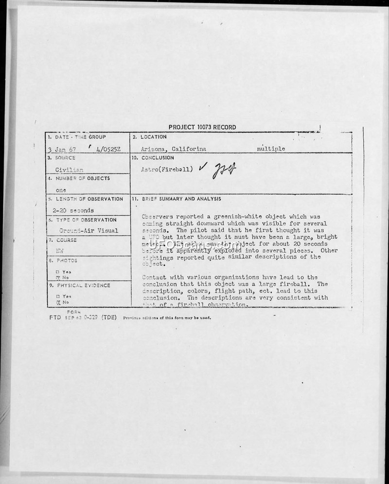 A series of reports from January 1967 describe a greenish-white object seen over Arizona and California. After investigation by multiple military and scientific agencies, the object was officially identified as a large fireball or meteor.