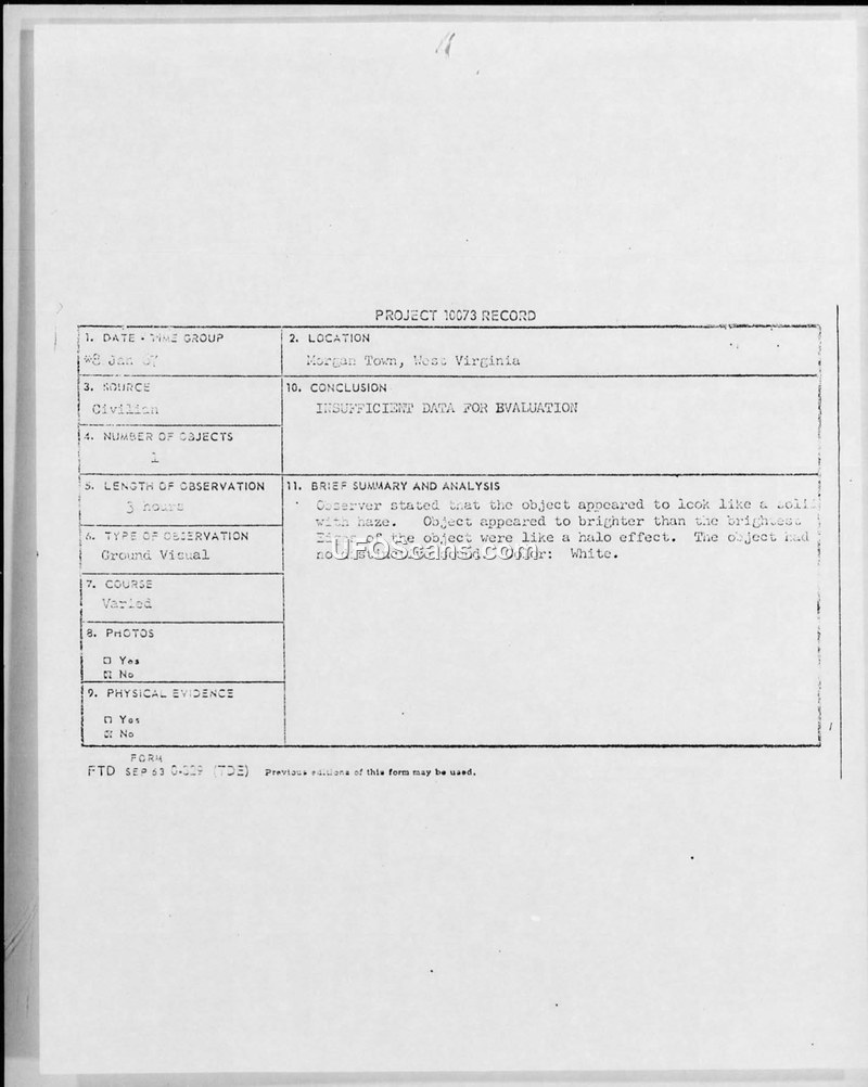 On 8 January 1967, a civilian witness in Morgantown, West Virginia, observed an unidentified aerial phenomenon for approximately three hours. The witness described the object as a white, solid-looking entity surrounded by a haze and exhibiting a halo effect. According to the witness, the object's course was varied; it appeared to stand still at times, moved, and disappeared and reappeared. The witness noted that the object made no distinctive sound. The observation was initially reported to the Duty Officer at Wright-Patterson Air Force Base in Ohio. On 9 January 1967, Colonel James C. Manatt, Director of Technology and Subsystems for the U.S. Air Force, sent correspondence to the witness stating that the initial report was insufficient for a formal evaluation. The Air Force provided an FTD Form 164 for the witness to complete and return to provide more detailed information. The official conclusion recorded on the Project 10073 record for this incident is 'INSUFFICIENT DATA FOR EVALUATION'.