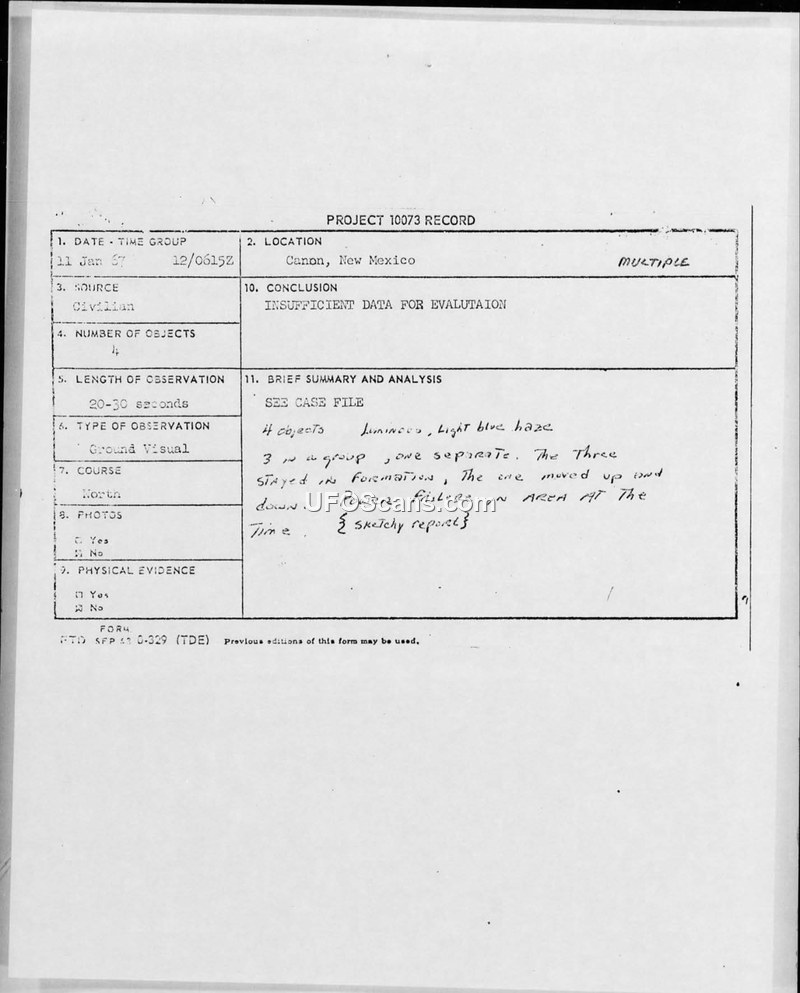 A civilian sighting of four luminous objects in Canon, New Mexico, on January 11, 1967, was investigated by the Air Force. The report was ultimately classified as having insufficient data for evaluation.