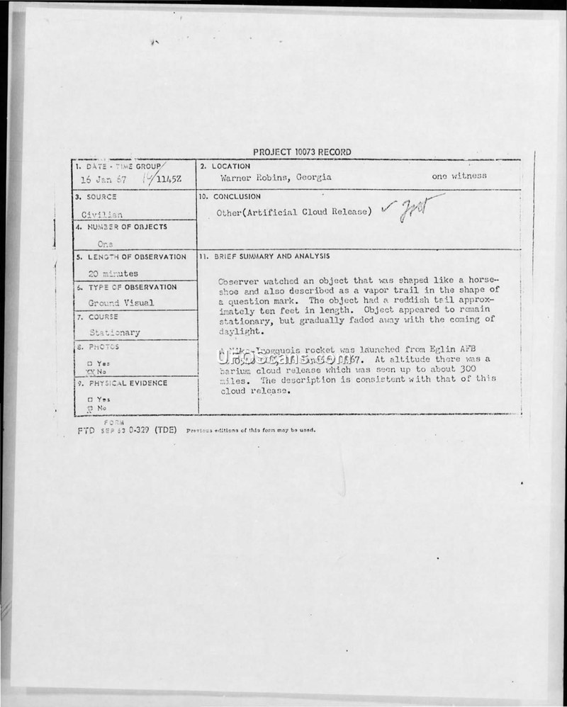 PROJECT 10073 RECORD: Sighting of 16 January 1967, Warner Robins, Georgia