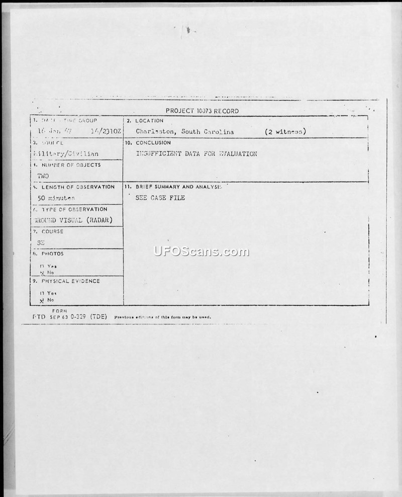 Project 10073 Record: UFO Observation, Charleston, South Carolina, 16 January 1967