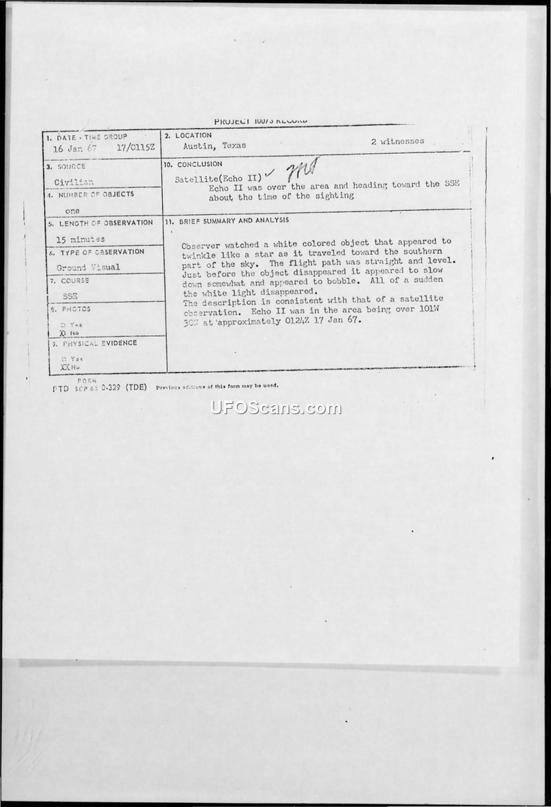 This document contains records and correspondence regarding two separate UFO sightings reported in the Austin, Texas area in January 1967. The first incident occurred on 16 January 1967, involving a white, star-like object observed for 15 minutes. The official conclusion for this event was that the observer had witnessed the Echo II satellite, which was confirmed to be in the area at the time. The second incident occurred on 29 January 1967, involving two witnesses who observed a white light while traveling in an automobile west of Austin. The witnesses described the object as appearing like a star, noting a popping or crackling sound similar to static electricity. The duration of this sighting was approximately four minutes. The Air Force investigation into the second sighting involved coordination with Austin RAPCON, which reported a radar target in the area at the time, though it was identified as weather. Further analysis suggested the object might have been the planet Sirius, with the movement of the observers' vehicle and high, scattered cirrus clouds potentially creating an illusion of motion. The document includes the original FTD Form 164 questionnaires completed by the witnesses, as well as internal Air Force communications regarding the investigation and the request for further information from the witnesses.