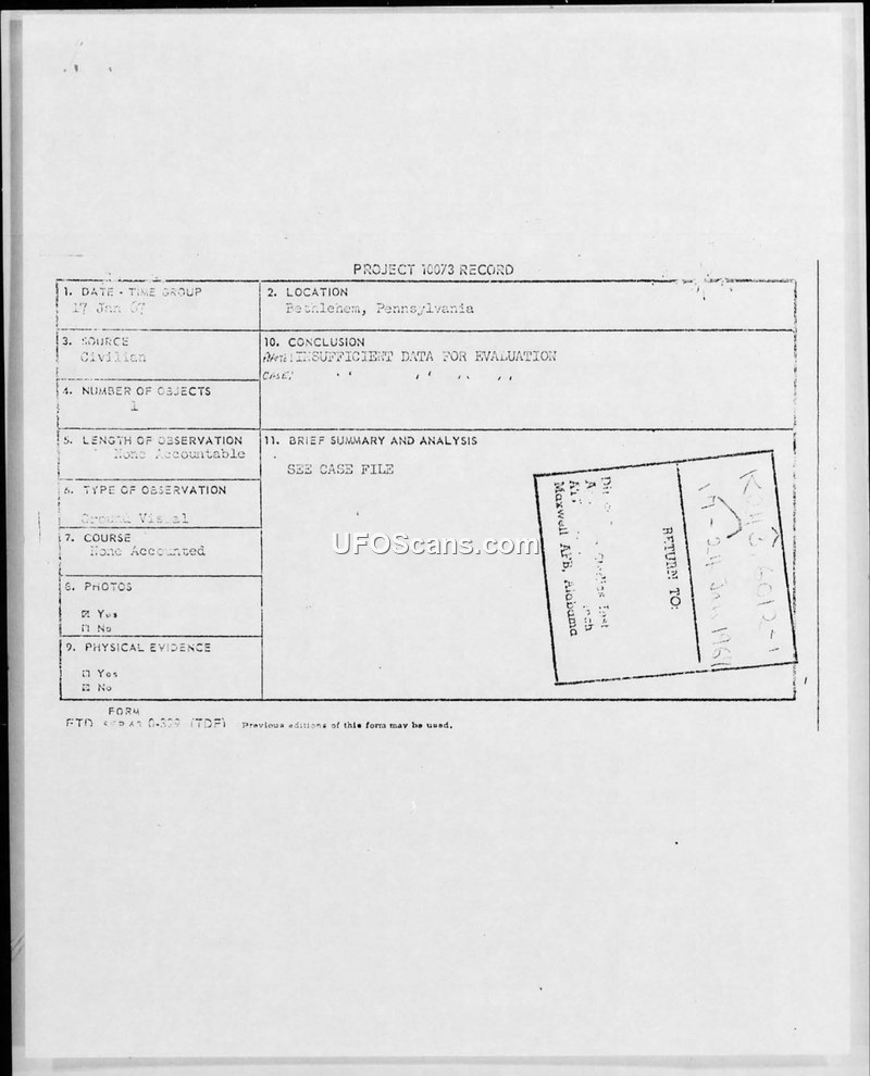 Project 10073 Record — Bethlehem, Pennsylvania, 17 January 1967