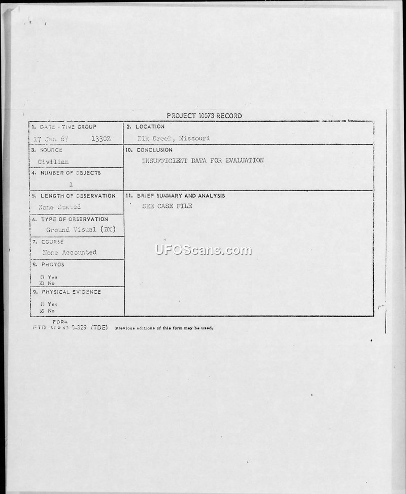 A civilian reported a UFO sighting in Elk Creek, Missouri, on January 17, 1967. The Air Force determined the data was insufficient for evaluation, though the case received special handling due to its referral from the White House.